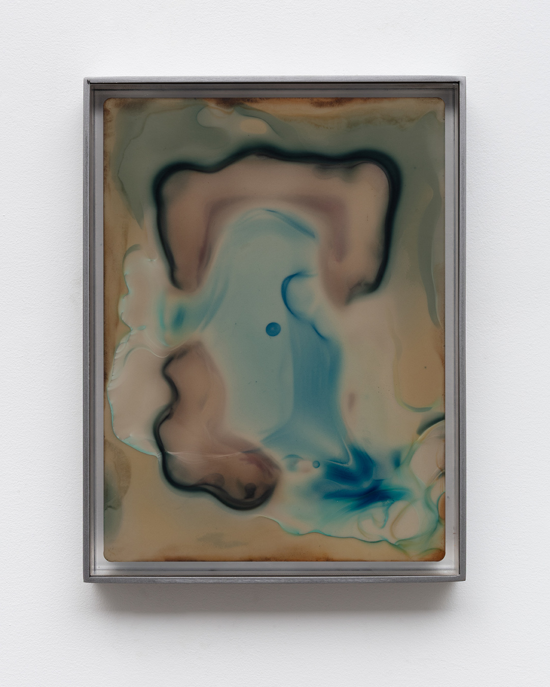 Blue Thin Horizon presents a series of new chemical reaction paintings and candlelit works. Borden’s practice employs a hybrid of chemical and organic processes to create images that resist stasis. These are not fixed pictures but living surfaces, shifting imperceptibly over time. Each work functions as an “anti-captured” portrait of nature, self-generating and in flux, where traces of earlier states remain embedded within the surface.