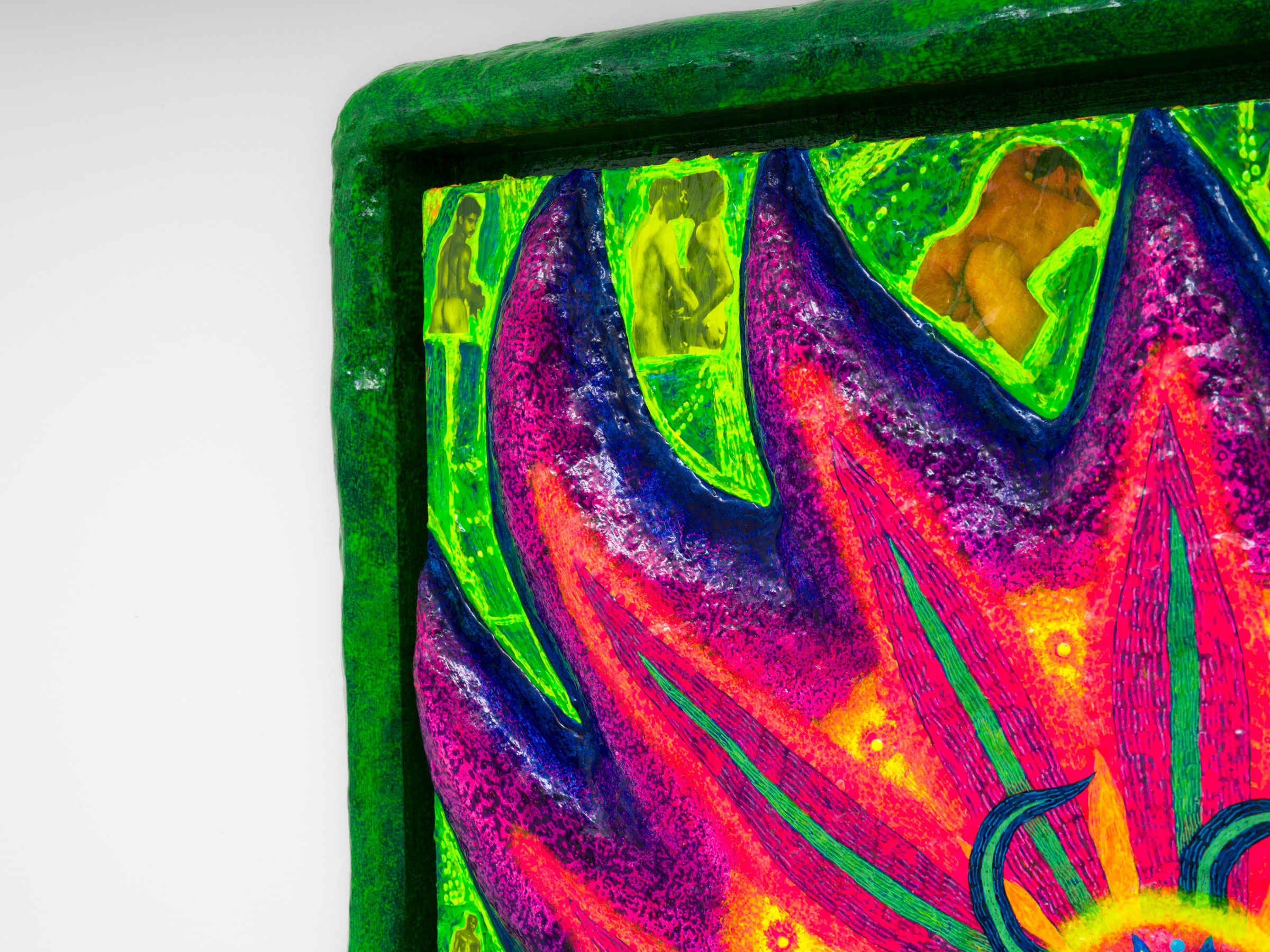Christian Rogers (born 1986, Portland, Oregon) uses paint, collage, and sculpted surfaces to explore themes of unabashed queer love, lust, and joy. Half grounded in reality, the other half in fantasy, Christian depicts Garden of Eden-like landscapes where endless visual and visceral titillation take place. Men wander the vast floral playground looking for fun, taking part in the liberation and the nitrite rush of queer romance. Sculpted forms bubble from the surface, resembling the curves of a pectoral muscle or chiseled bicep, and over the bodily shapes, layers of fluorescent paint function like skin. The collaged men in the paintings are found objects sourced from vintage porn, included in the mise en scène as a means of preserving our collective queer history. While being vessels of desire, the men represent a way of remembering and memorializing our forefathers who came before us—many of whom lost their lives to HIV/AIDS during the height of the crisis. Christian’s paintings are at once an incandescent manifestation of queer bliss, an act of historical reclamation, and an illustration of the erotic utopia of which he dreams.