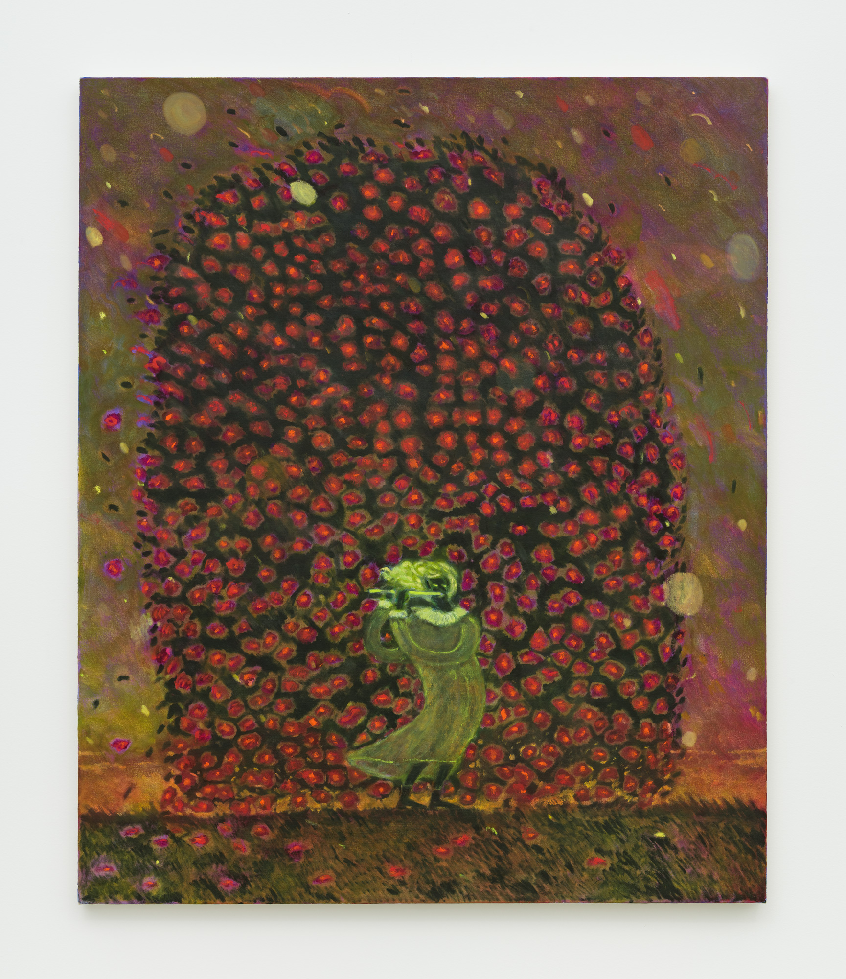 Feywild is the free place. In the wake of a conceptual milieu, Biado paints. He flaunts color despite its reputed shroud of romance and heralds risk despite the probability of failure. And out of it, joy, death and reckless abandon, “like dancing at the end of the world.” The characters he creates are beyond self-consciousness, as identity is without construct, and to be is full-blown — BWAMP! Pointed ears, rat brass, a wine-coloured atmosphere in which a flautist summons a glittering storm, a green-skinned figure runs through a tornado of tulip petals with their arms and hair flying, free — these are the emblems of a feeling of wildness that painting can conjure. It is an act of pleasure and life, of feeling, where the banal can be made psychedelic and there is space to be playful. “Because I believe [painting] to be actual magic, a conduit to the subconscious, a forever mystery.”
