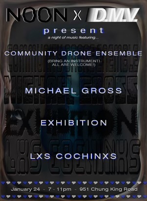 The evening runs from 7–11 PM and includes three musical performances, beginning with a community drone session. Attendees are invited to bring an instrument or sound-making object to contribute to a collective drone lasting approximately 10–15 minutes, gradually giving way to the first act. Performances will continue throughout the evening until 11 PM. Refreshments will be served.