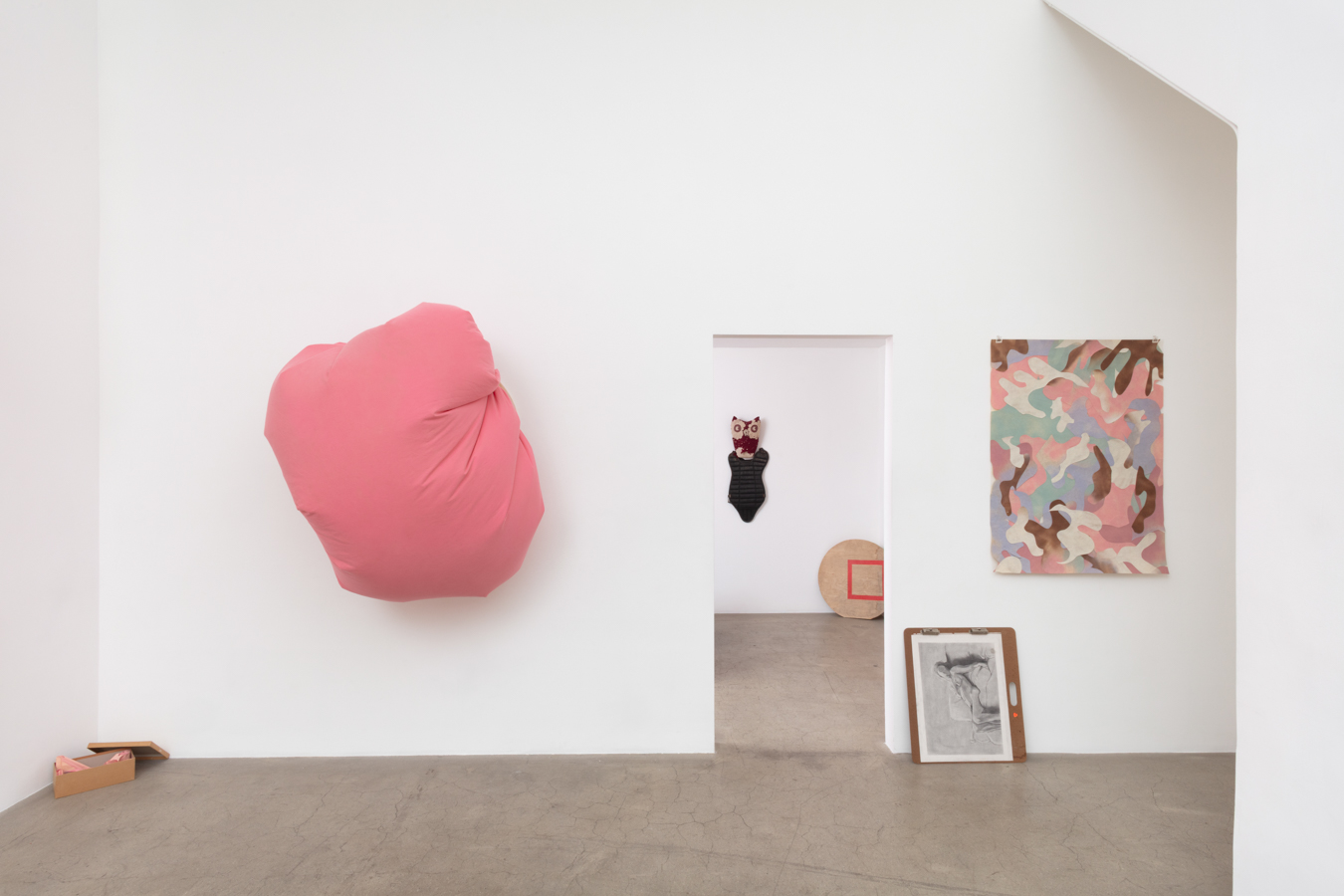 The sculptures, paintings, and drawings in this presentation offer a glimpse of a larger body of work over fifteen years in the making. While the form of an exhibition demands abridgement, the full sweep of this project remains a reverberating presence. Each piece in "Where there is great love . . ." is the result of a chain of responsive interventions: Shull may extend, distill, or recontextualize an element in response to its associative potential. Extrapolating the form of a gun from a particular configuration of blocky, shaped canvases in an early iteration of "Flesh Field" (2003), the artist made this association explicit by inscribing a pistol grip directly on the wall with Sharpie. The drawing "Road Romeo" (2003) is an inventive homage to the name of a bus that Shull spotted while working on an off-off-Bollywood production in Guyana. Struck by the schmaltzy designation, the artist concocted his own vision of romance in motion: a headboard (a decor flourish rattling with naughty subtext) on wheels, their rotation and velocity conveyed by Shull through spectral doubling and brisk, dizzying motion trails. Evocations run amok: the straightforwardly titled "Inflatable Bedsheet" (2012) is at turns swollen with hot air and abjectly flaccid, like some giant wad of bubble gum engorged and then collapsed, sans the decisive, sexy snap; made of vellum, a substrate derived from animal skins, the blush-colored folds of "Paper Vaginas"(2002) have devastatingly Freudian origins (an attempted Mother’s Day card).