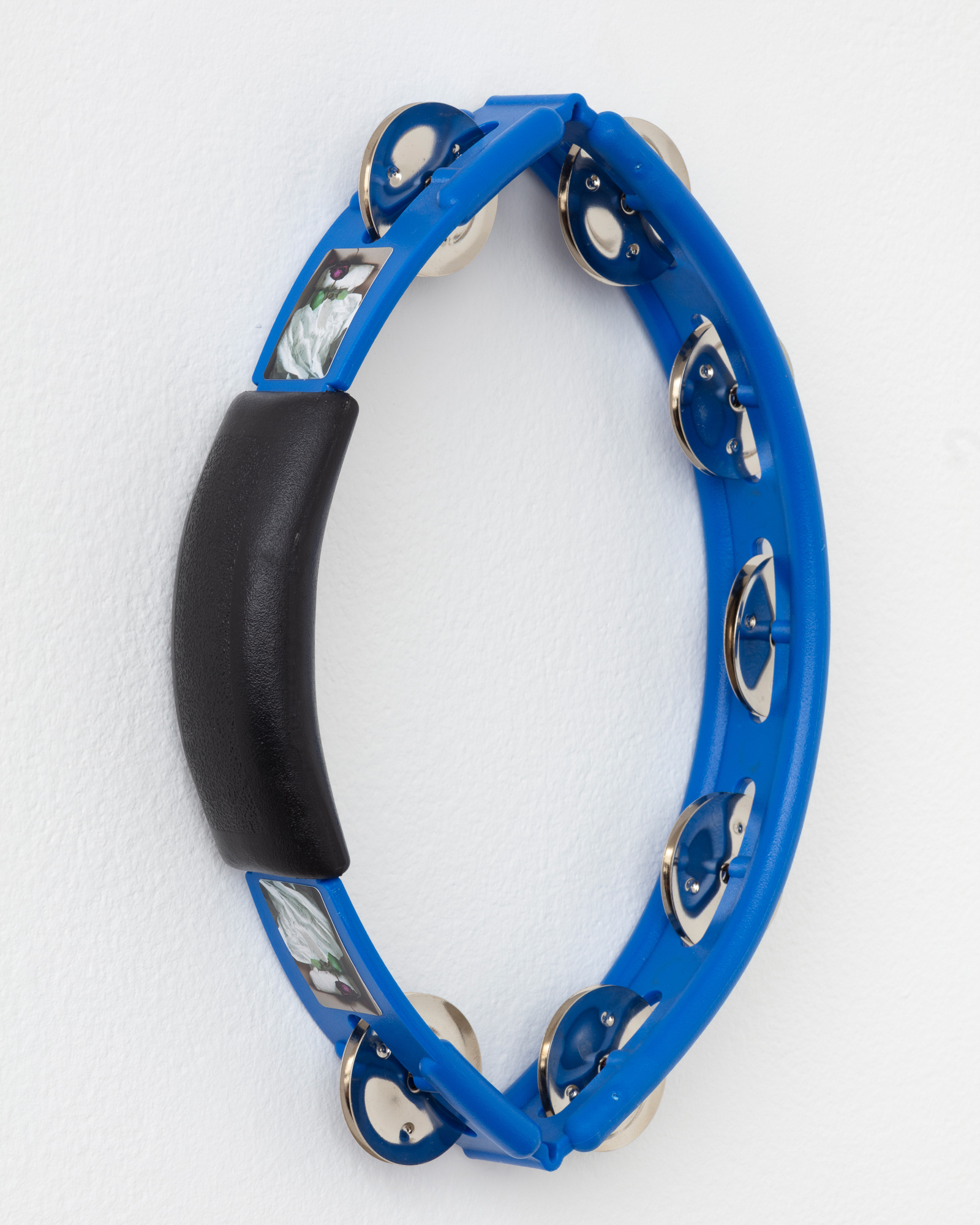 Surrounding the films, Kiiski’s sculptures are made from found, used, and inherited materials—ceramic dolphins, home decor, shoelaces, and wilted painted flowers—objects pre-charged with the residue of personal histories, consumer cycles, and cultural kitsch. Rather than purify or explain, Kiiski allows these materials to remain in their in-betweenness: awkward, sentimental, and animate. The works explore an aesthetic that sits at the crossroads of crumbling modern civilization and its detritus. Kiiski’s readymades become emblematic: Maslow's triangle, the mug as a vessel of comfort, the dolphin as a symbol of intelligence, play, and captivity. On the back wall are two photographic assemblages, presented in ultramarine blue frames. Created with a printed passe-partout, each contains four images arranged like holiday snapshots, hung on the wall like a family heirloom.