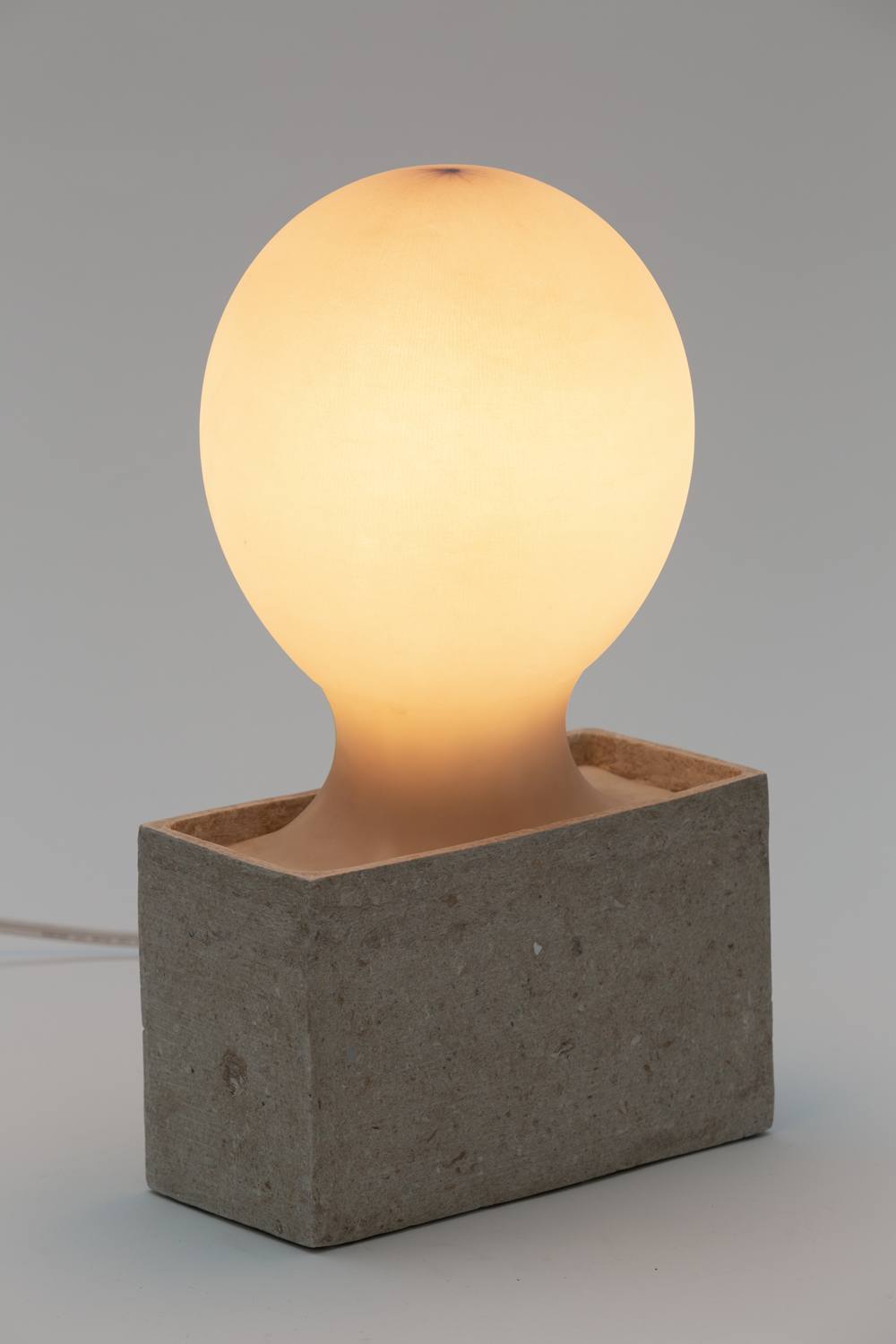 Cherry’s lamps are buoyant, bulbous yet seemingly delicate as sea foam, and are similarly composed of suspended organic pulp—here a blend of studio floor sweepings mixed with sawdust, paper and coconut husks. Their shades are made from salvaged fabric mesh stretched over forms and painted with coats of resin. Lamps appeal to Cherry for their ability to inform the reading of their surroundings. Subtly altering the tones and contours of their environment, they retain a measure of control over the spaces they inhabit (and thus control over how the object itself is viewed). “Lamps,” the artist explains, “are for other people,” and in anticipation their fragile bulbs are protected by resin shades. Privacy drives these works, as evidenced by the artist’s choice of materials, found or formulated to his specifications and wherever possible absent of art-historical associations, a way of erasing the artist’s referential trail. Cherry wields control preemptively, as a means of promising safety in a world that might threaten it.