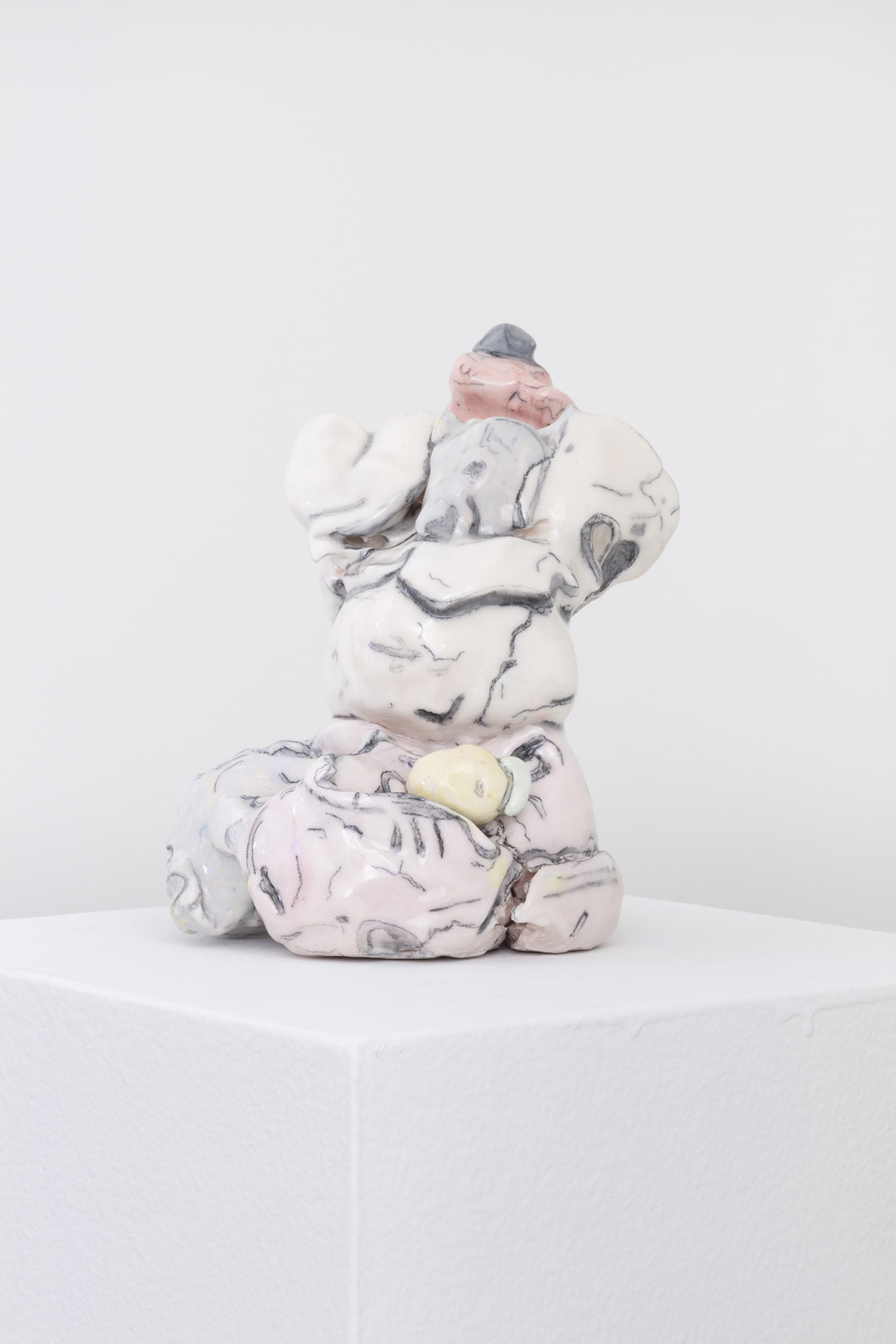 Jackson’s practice is often dedicated to creating utilitarian form through self- taught craft. She states, “I am interested in the role of objects in a good life. What could a thing do?” She is most known for her vessels made of porcelain—large vases, tiny cups and asymmetrical bowls—as well as textile work made up of quilted pillows and blankets that adorn pieces of furniture in her own home and those of collectors and institutions.