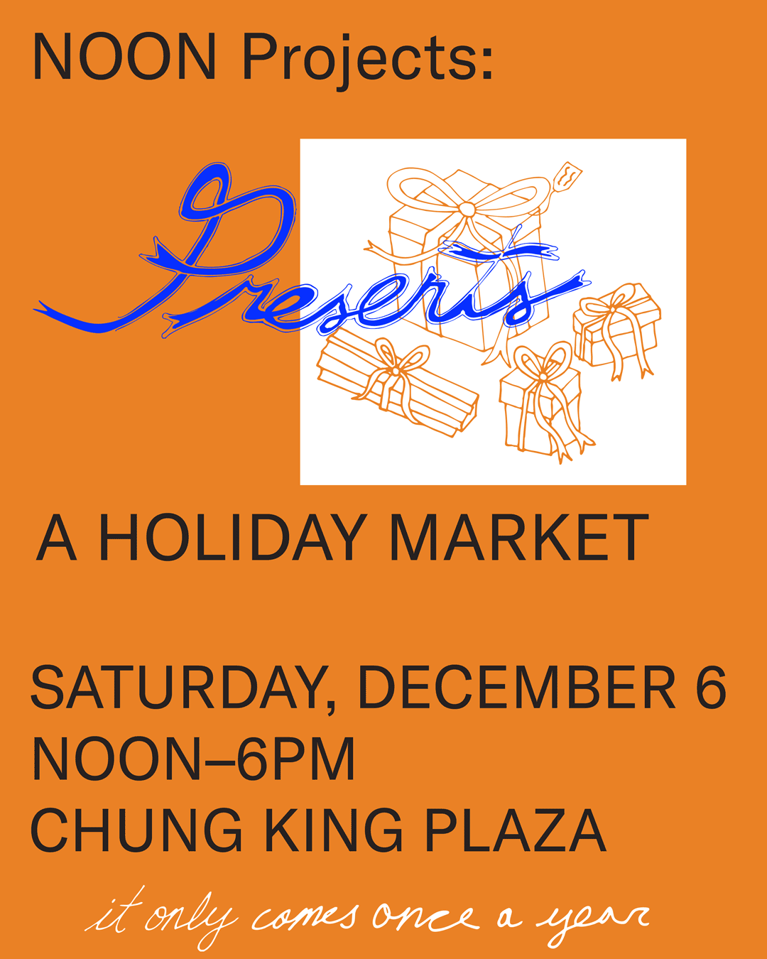NOON Projects is excited to host “Presents,” our first annual holiday market, taking place in Chung King Plaza on December 6, 2025, from Noon–6 PM.
